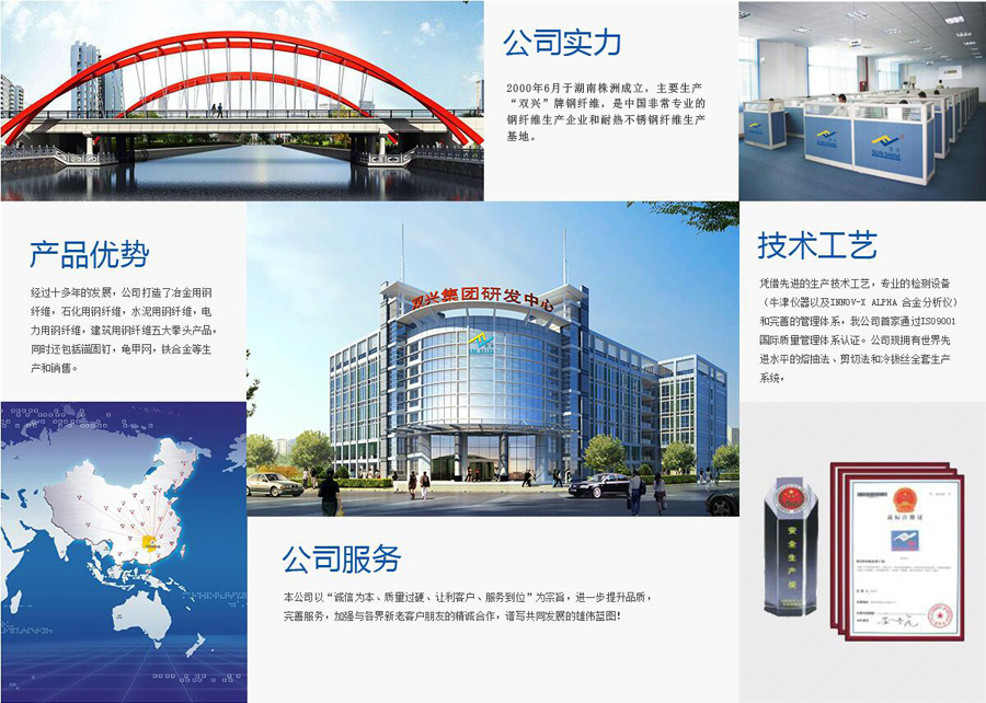 湖南雙興鋼纖維有限責(zé)任公司,2000年6月于湖南株洲成立,主要生產(chǎn)“雙興”牌鋼纖維,是中國(guó)非常專業(yè)的鋼纖維生產(chǎn)企業(yè)和耐熱不銹鋼纖維生產(chǎn)基地。